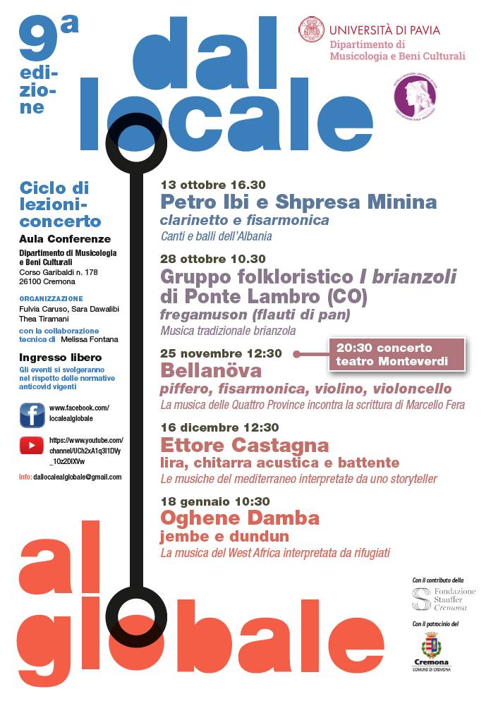 Dal locale al globale è una rassegna di lezioni-concerto promossa dalla prof.ssa Fulvia Caruso dell’Università di Pavia nell’ambito dei corsi di Etnomusicologia grazie al sostegno di Fondazione Stauffer e il patrocinio del Comune. Obiettivo principale del progetto è quello di fornire agli studenti dei corsi e a tutti gli studenti e i cittadini cremonesi interessati la possibilità di ascoltare dal vivo repertori di estrazione popolare italiana ed extra-europea, confrontandosi attivamente con i musicisti portatori di queste tradizioni.