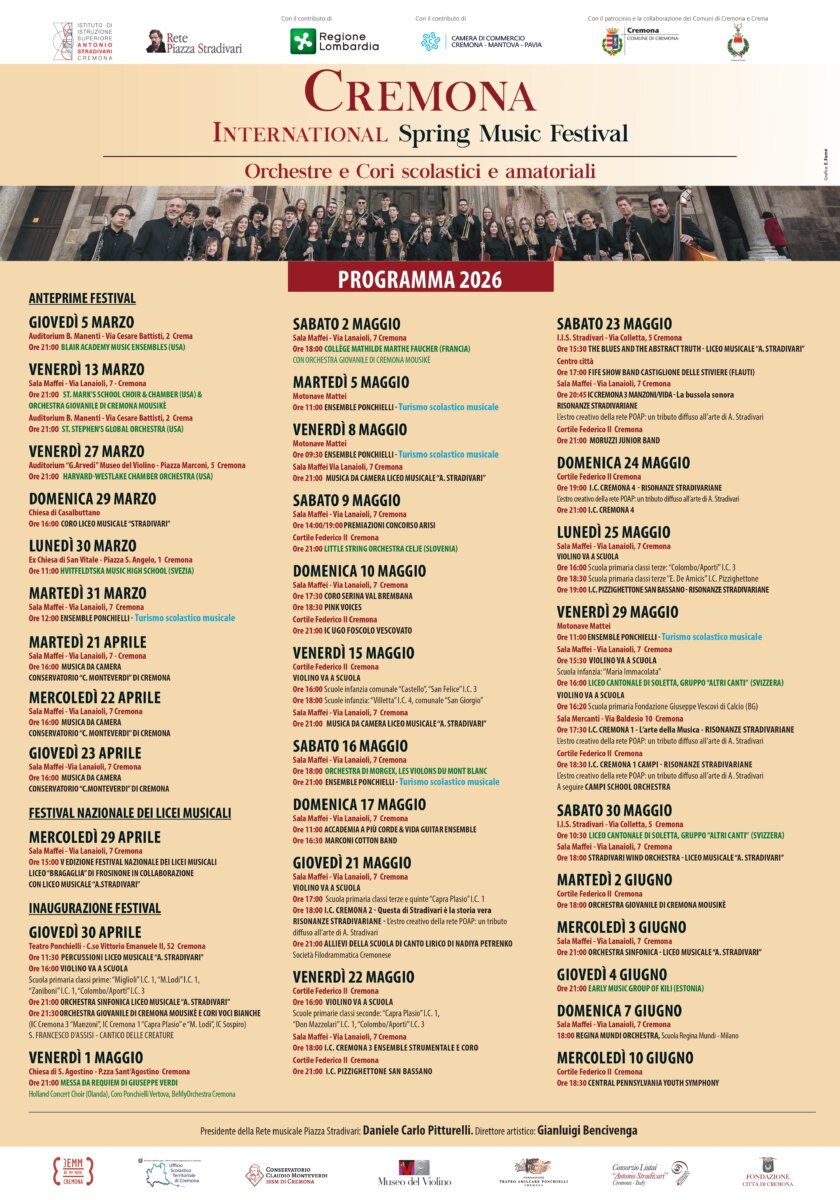 Si alza il sipario sulla quinta edizione del Cremona International Spring Music Festival, la prestigiosa rassegna che trasforma il territorio cremonese in un palcoscenico globale per orchestre e cori scolastici, amatoriali e professionistici.