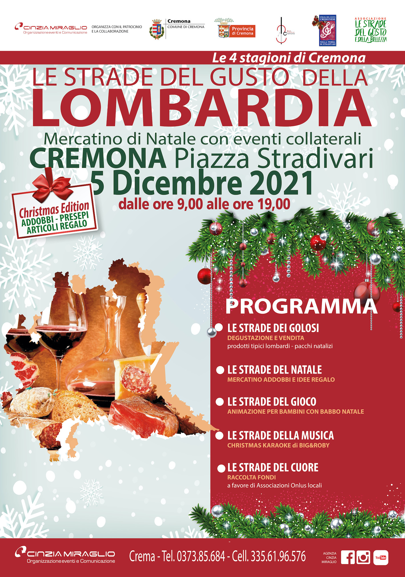 torna l’edizione CHRISTMAS EDITION del MERCATINO LE STRADE DEL GUSTO DELLA LOMBARDIA (dopo la data sospesa nel 2020 causa Covid) manifestazione inserita nel calendario degli eventi “Le 4 stagioni di Cremona” e nel calendario degli eventi dedicati al Natale della città di Cremona.