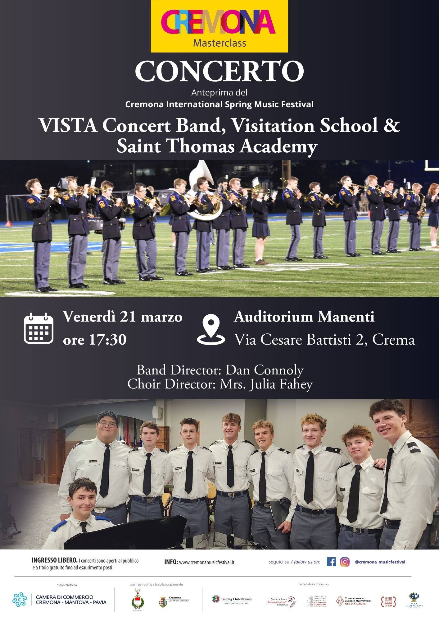 Venerdì 21 marzo 2025 alle ore 17:30 a Crema, il palco dell’Auditorium Manenti vedrà esibirsi la VISTA Concert Band, Visitation School & Saint Thomas Academy.